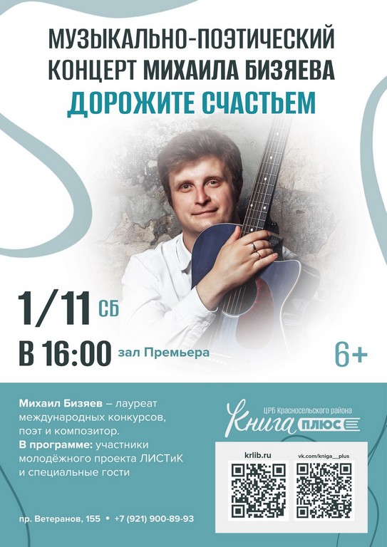 24 января (сб.) в 15:00 – музыкально-поэтический вечер «Как даль благословенная легка» с участием поэтов и музыкантов Санкт-Петербурга, резидентов творческого объединения «Синий мост» Юлией Резвовой, Еленой Ивановой-ВсеЛенкой, Гульнарой Гуськовой.