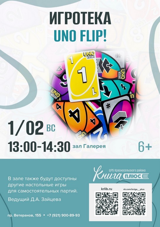 1 февраля (вс.) с 13:00 до 14:30 – игротека «UNO flip!». В зале также будут доступны другие настольные игры для самостоятельных партий. Ведущий Д.А. Зайцева. Зал «Галерея» (6+)