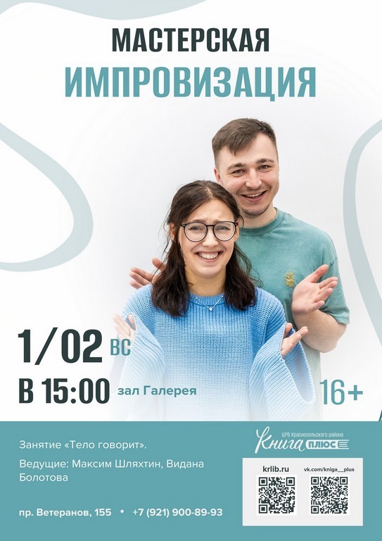 1 февраля (вс.) в 15:00 – мастерская «Импровизация», занятие «Тело говорит». Ведущие Максим Шляхтин и Видана Болотова. Зал «Галерея» (16+)