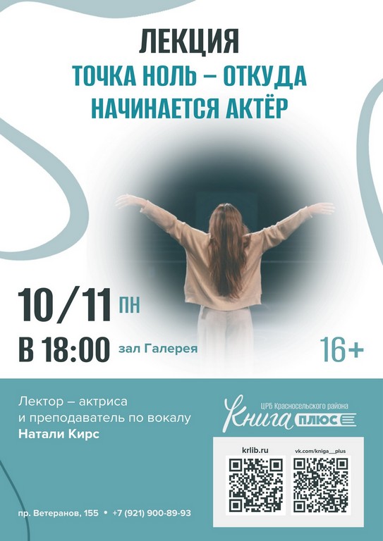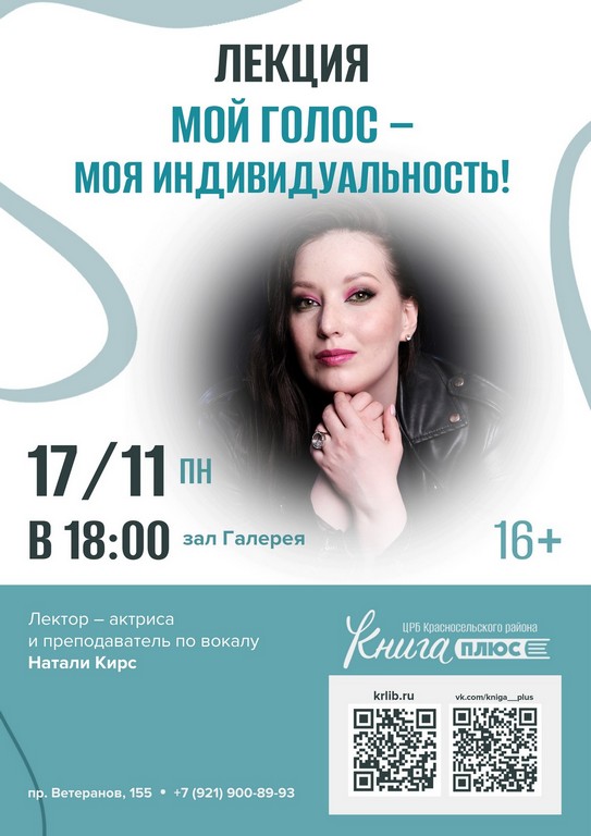 26 января (пн.) в 18:00 – лекция «Диафрагмальное дыхание и опора звука». Лектор – актриса и преподаватель по вокалу Наталья Кирс. Зал «Галерея» (16+)