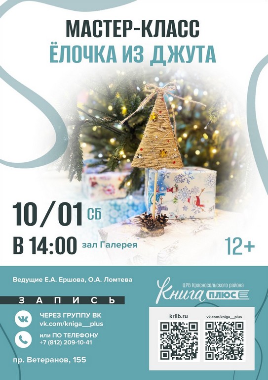 10 января (сб.) в 14:00 – мастер-класс «Ёлочка из джута». Ведущие Е.А. Ершова, О.А. Ломтева. Зал «Галерея» (12+)