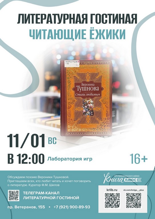 11 января (вс.) в 12:00 – литературная гостиная «Читающие ёжики». Куратор Ф.М. Шилов. Зал «Лаборатория игр» (16+)