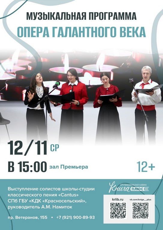 20 января (вт.) в 15:00 – концерт с элементами лекции «Как на улице шум...» из цикла «Песни и традиции» ансамбля русской народной песни «Крин» СПб ГБУ «КДК «Красносельский», руководитель – Бычковская Надежда Николаевна, ведущий – Степан Кудринский. В программе: календарно-обрядовый фольклор, хороводные песни. Зал «Премьера» (12+)