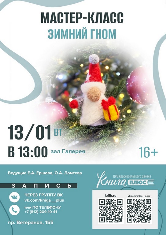 13 января (вт.) в 13:00 – мастер-класс «Зимний гном». Ведущие Е.А. Ершова, О.А. Ломтева. Зал «Галерея» (16+)