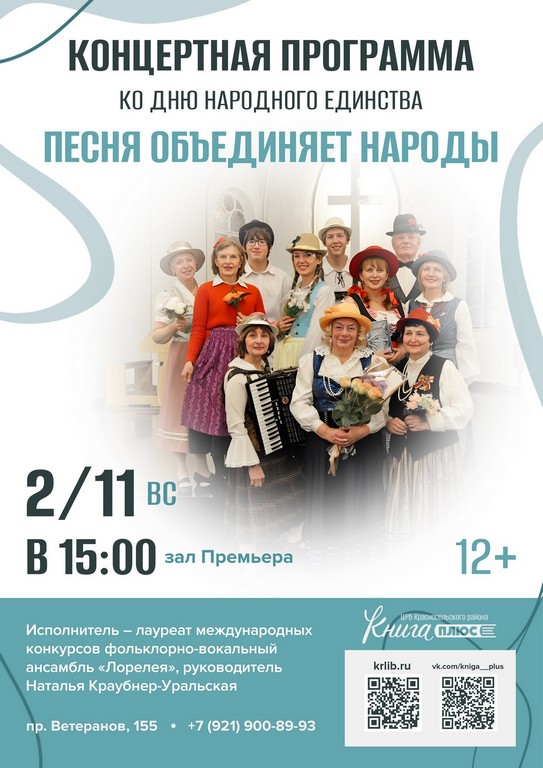 11 января (вс.) в 15:00 – концертная программа «Рождество в Германии». Исполнитель – лауреат международных конкурсов фольклорно-вокальный ансамбль «Лорелея», руководитель Наталья Краубнер-Уральская. Зал «Премьера» (12+)