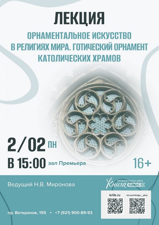 2 февраля (пн.) в 15:00 – лекция «Орнаментальное искусство в религиях мира. Готический орнамент католических храмов». Ведущий Н.В. Миронова. Зал «Премьера» (16+).