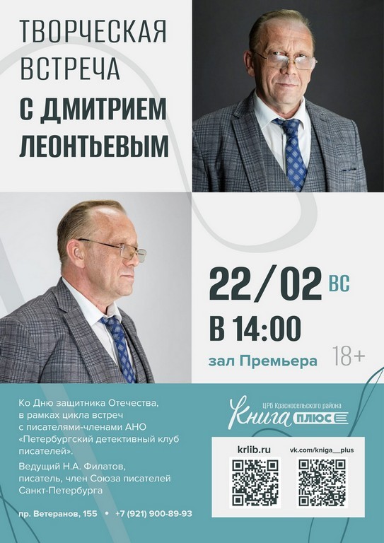 22 февраля (вс.) в 14:00 – творческая встреча с Дмитрием Леонтьевым, ко Дню защитника Отечества, в рамках цикла встреч с писателями-членами АНО «Петербургский детективный клуб писателей». Ведущий Н.А. Филатов, писатель, член Союза писателей Санкт-Петербурга. Зал «Премьера» (18+)