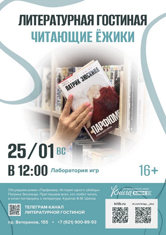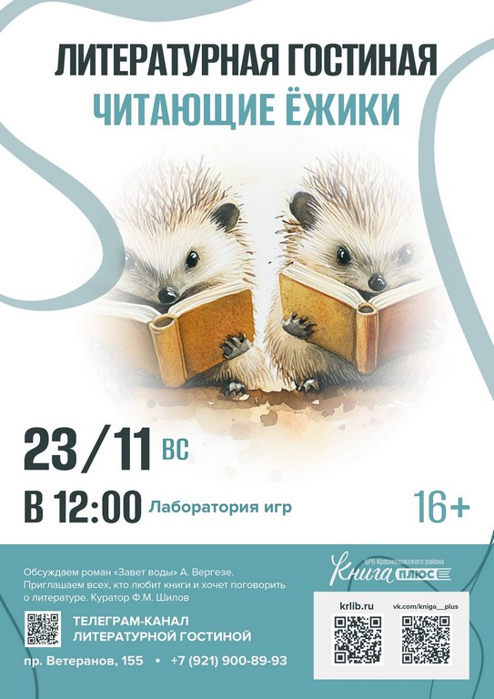 25 января (вс.) в 12:00 – литературная гостиная «Читающие ёжики». Куратор Ф.М. Шилов. Зал «Лаборатория игр» (16+)