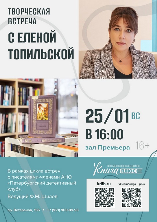 25 января (вс.) в 16:00 – творческая встреча с Е.В. Топильской, автором культовых детективных романов и телесценариев в рамках цикла встреч с писателями-членами АНО «Петербургский детективный клуб». Ведущий Ф.М. Шилов. Зал «Премьера» (18+)