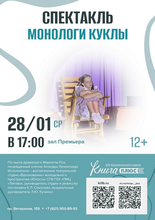 28 января (ср.) в 17:00 – спектакль «Монологи куклы» по пьесе драматурга Мариэтты Роз, посвященный Дню полного освобождения Ленинграда от фашисткой блокады.