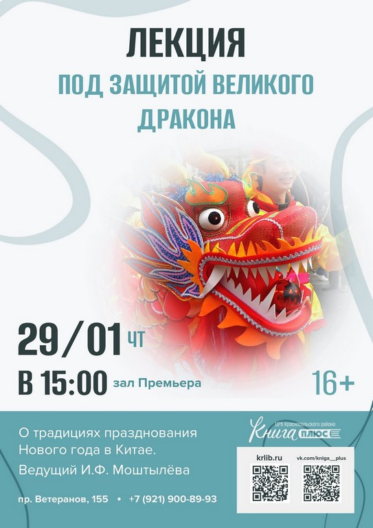 29 января (чт.) в 15:00 – лекция о традициях празднования Нового года в Китае «Под защитой великого дракона». Ведущий И.Ф. Моштылёва. Зал «Премьера» (16+)
