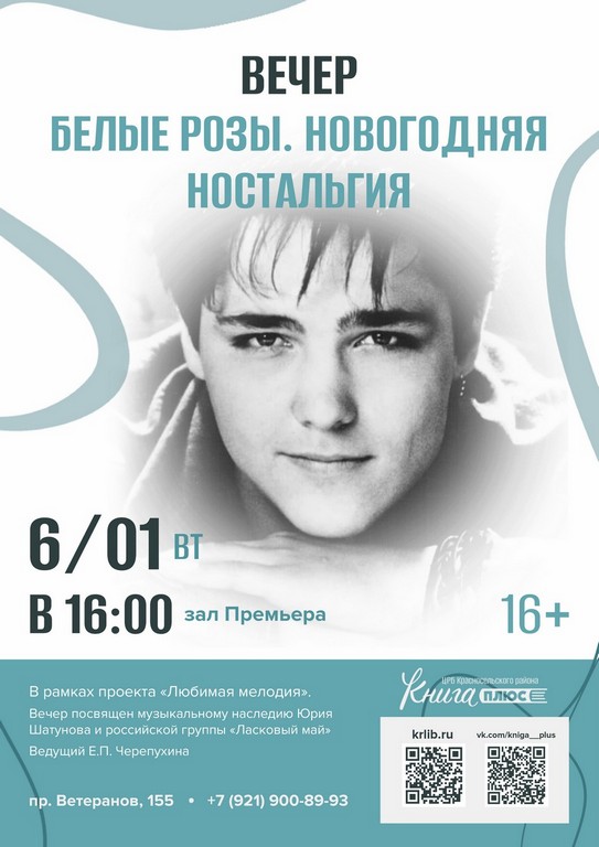 6 января (вт.) в 16:00 – «Белые розы. Новогодняя ностальгия» – вечер, посвященный музыкальному наследию Юрия Шатунова и известной российской группы «Ласковый май», в рамках проекта «Любимая мелодия». Ведущий Е.П. Черепухина. Зал «Премьера» (16+)