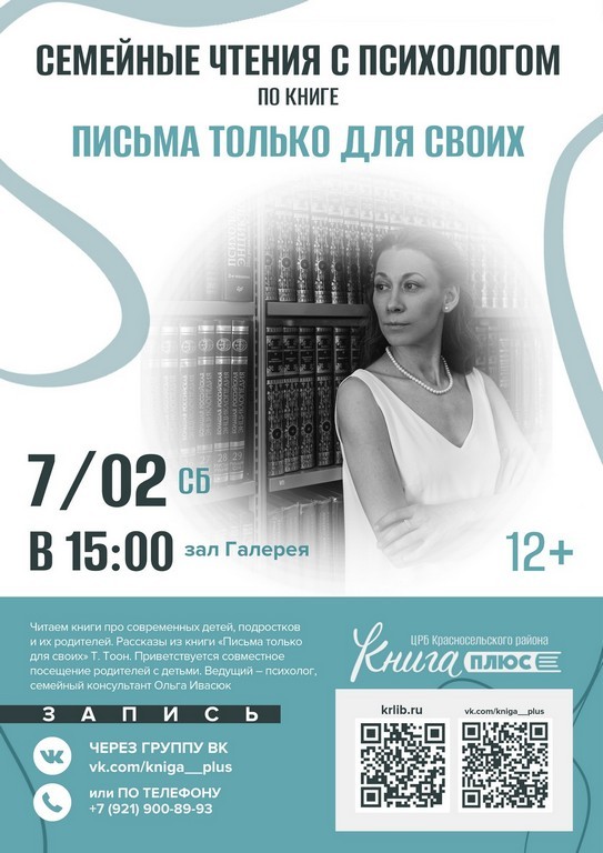 7 февраля (сб.) в 15:00 – семейные чтения с психологом о трудностях современных детей, подростков и родителей. По книге «Письма только для своих» Теллегена Тоона. Ведущий – психолог, семейный консультант Ольга Ивасюк. Зал «Галерея» (12+)