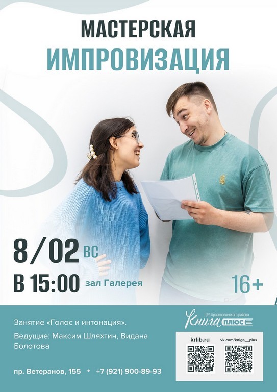 8 февраля (вс.) в 15:00 – мастерская «Импровизация», занятие «Голос и интонация». Ведущие Максим Шляхтин и Видана Болотова. Зал «Галерея» (16+)