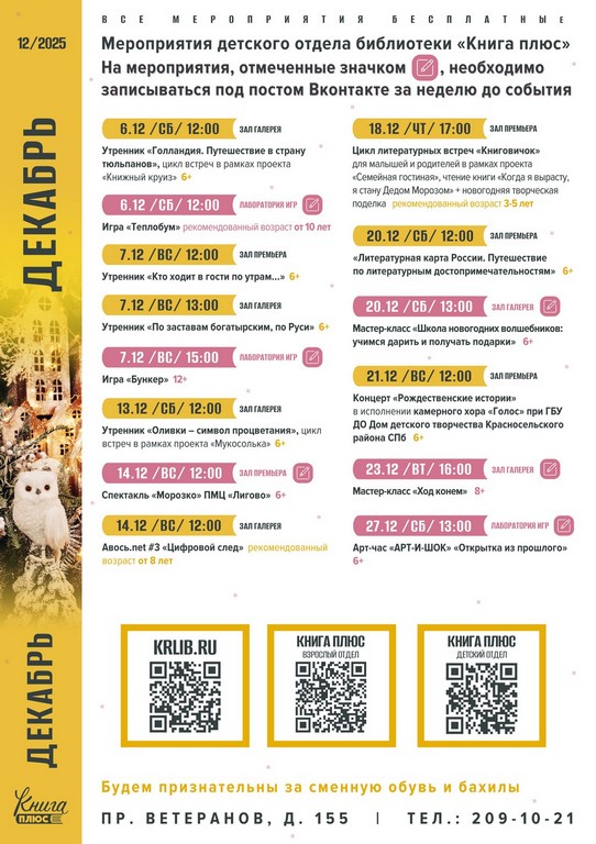 20.12.2025 13:00 Мастер-класс «Школа новогодних волшебников: учимся дарить и получать подарки», 6+, зал Галерея, по записи под постом ВКонтакте за неделю до события