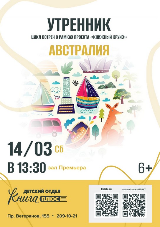 14.03.2026 13:30 Утренник «Австралия» цикл встреч в рамках проекта «Книжный круиз», 6+, зал Премьера