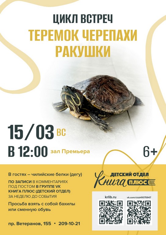 15.03.2026 12:00 Цикл встреч «Теремок черепахи Ракушки». В гостях — чилийские белки (дегу), 6+, зал Премьера, по записи под постом ВКонтакте, за неделю до события