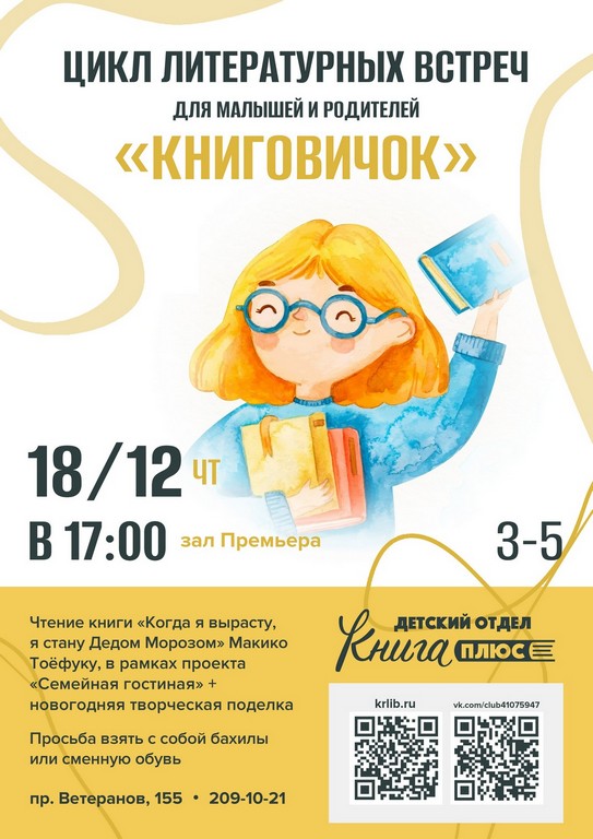 18.12.2025 17:00 Цикл литературных встреч Книговичок для малышей и родителей в рамках проекта «Семейная гостиная», чтение книги «Когда я вырасту, я стану Дедом Морозом» + новогодняя творческая поделка, 3-5 лет, зал Премьера