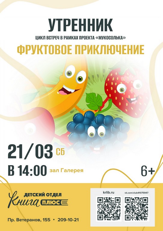 21.03.2026 14:00 Утренник «Фруктовое приключение» цикл встреч в рамках проекта «Мукосолька», 6+, зал Галерея