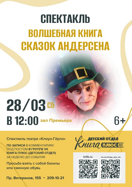 28.03.2026 12:00 Спектакль театра «Клоун-Гёрлз» «Волшебная книга сказок Андерсена», 6+, зал Премьера, по записи под постом ВКонтакте, за неделю до события