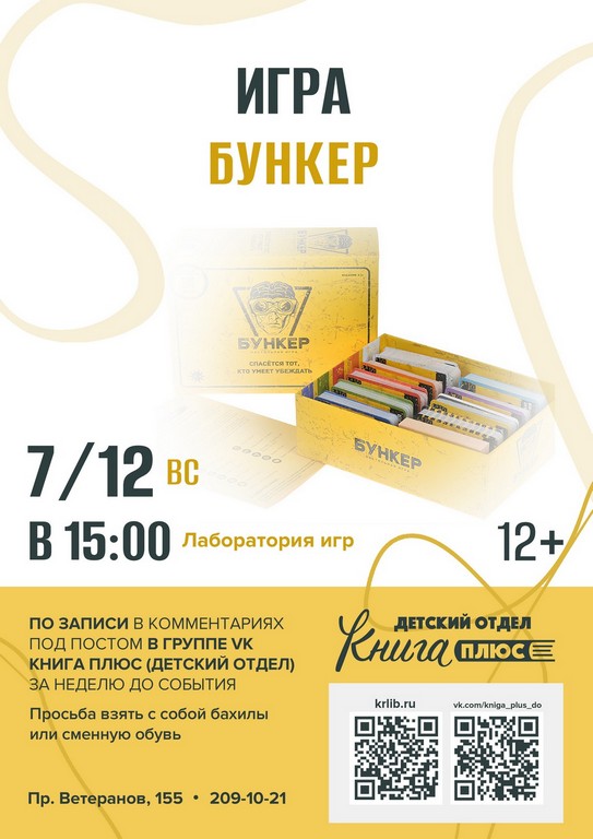 07.12.2025 15:00 Игра Бункер, 12+, зал Лаборатория игр, коммуникационная настольная игра, по записи под постом ВКонтакте за неделю до события
