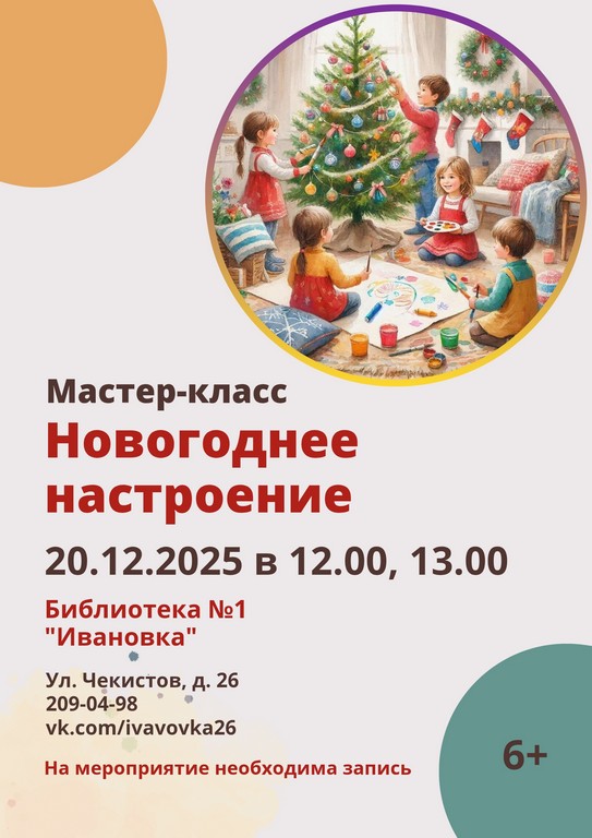 20 декабря / 12:00, 13:00 – мастер-класс семейный «Новогоднее настроение» (6+).