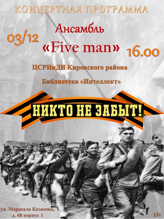 Ср 03.12 / 16.00-17.00 – Концерт «Никто не забыт!» в рамках международного фестиваля «Эстафета доброты», 6+