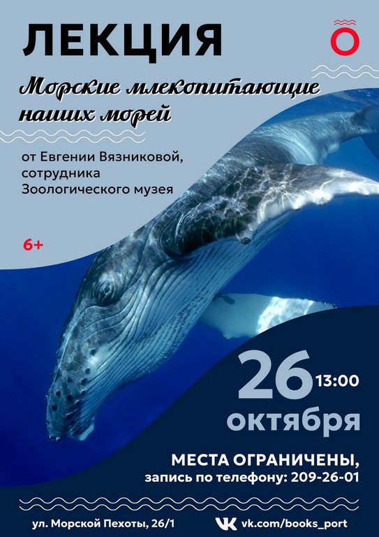 13:00 Лекция «Морские млекопитающие наших морей» от Евгении Вязниковой, сотрудника Зоологического музея 6+