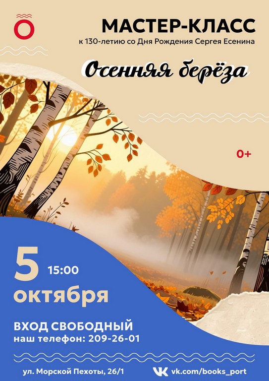 - 15:00 Мастер-класс «Осенняя берёза» к 130-летию со Дня Рождения Сергея Есенина 0+