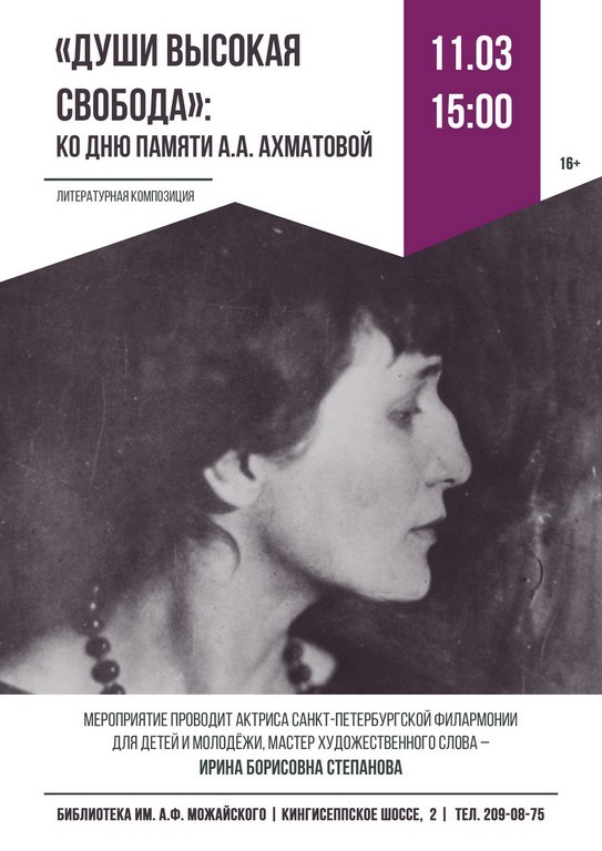 11.03 в 15:00 (ср.) литературная композиция «Души высокая свобода»: ко дню памяти А.А. Ахматовой