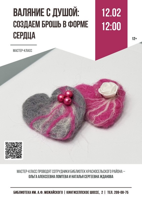 12.02 в 12:00 (чт.) мастер-класс «Валяние с душой: создаем брошь в форме сердца»