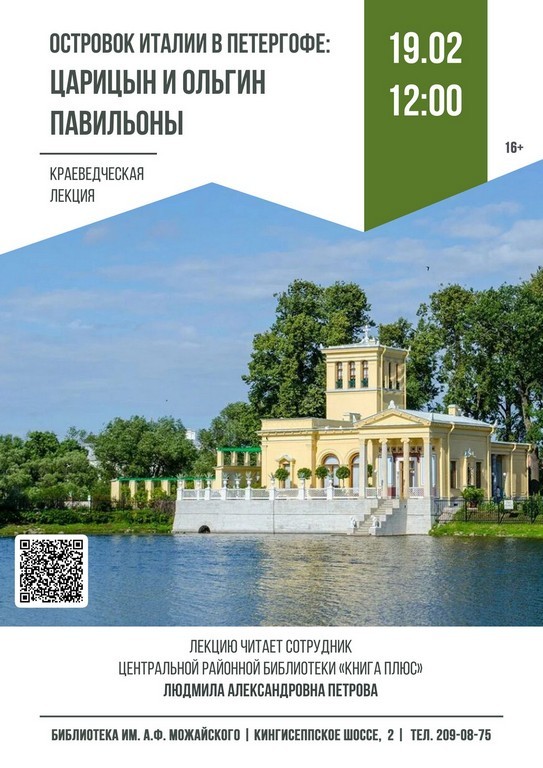 19.02 в 12:00 (чт.) краеведческая лекция «Островок Италии в Петергофе: Царицын и Ольгин павильоны»