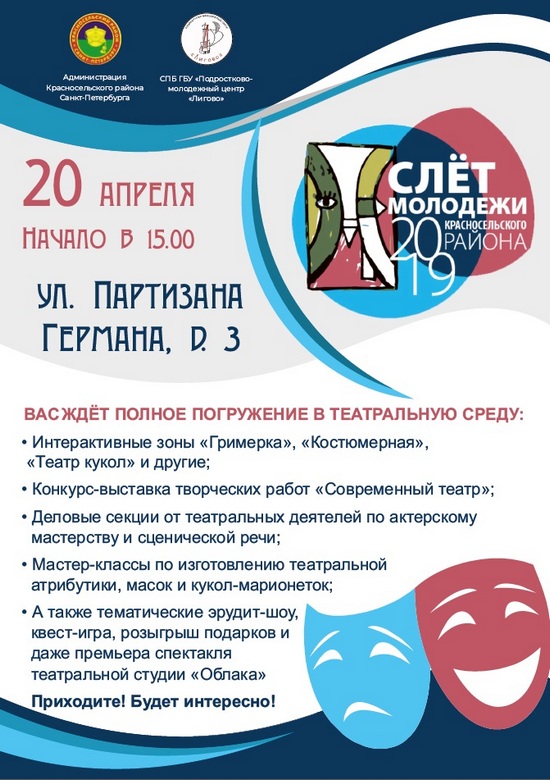 20 апреля 2019 года в администрации Красносельского района Санкт-Петербурга состоится традиционный Слет молодежи, история которого началась в 2010 году, с тех пор проводится ежегодно и собирает около 1000 молодых активных людей.